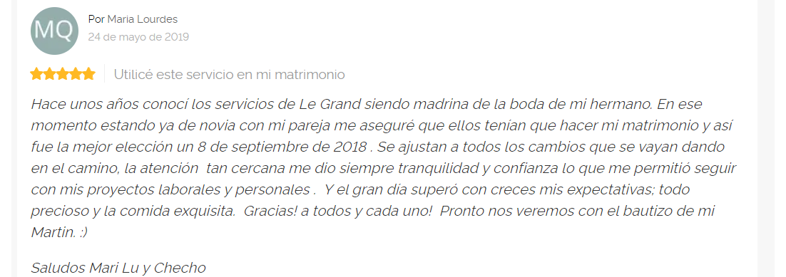 Banquetera Le Grand Event queremos junto a mi esposo agradecer la gestión tan profesional y excelente que demostraron el día de ayer en nuestro matrimonio.